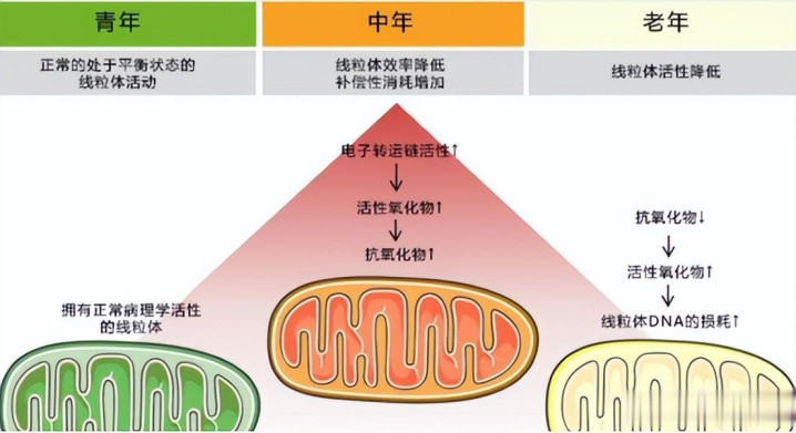 随着食物成分抗衰的应用思路遇阻,科学家们很快将目光锁定在了人类衰老关键标志物之一的线粒体上。线粒体被广泛称作“细胞发电厂”,我们的运动、思考、器官运转,都离不开它的正常“供电”。但线粒体也会老化,从而导致细胞能量匮乏,这也是为什么人至中年出现容易疲惫、肌肉萎缩、代谢变慢等衰老现象的根本原因。